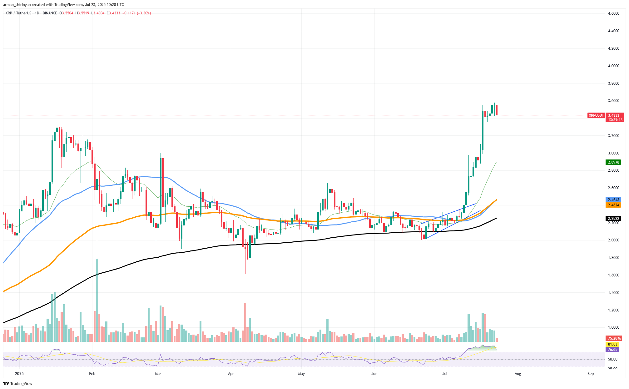 尽管市场整体持续波动,XRP仍展现出非凡的韧性——即便进入了预期的回调阶段。当前资产价格在触及3.60美元后虽经历小幅修正,但市场结构仍保持强劲看涨态势。与短暂冲高不同,价格图表显示XRP经历了稳健突破后的盘整,这种形态正是持久牛市行情的典型特征。