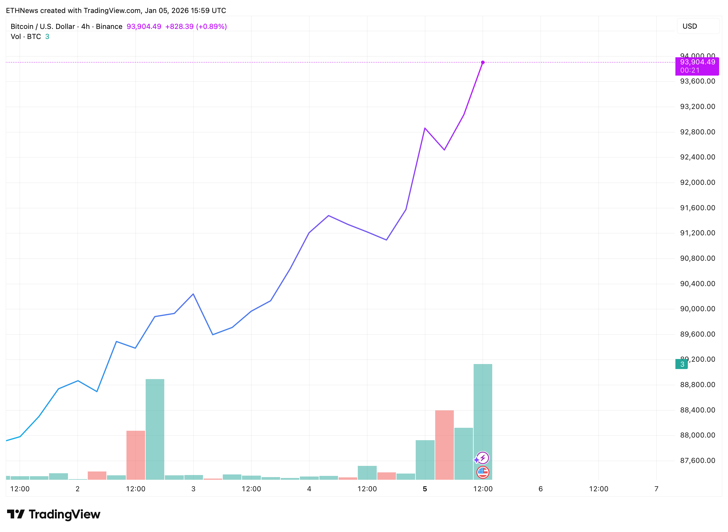 尽管矿工面临压力,截至2026年1月5日,比特币价格仍攀升至四周高点,交易价格约93,900美元。币价上涨与算力下降的背离现象表明,当前更广泛的市场需求暂时抵消了挖矿领域的短期阻力。
