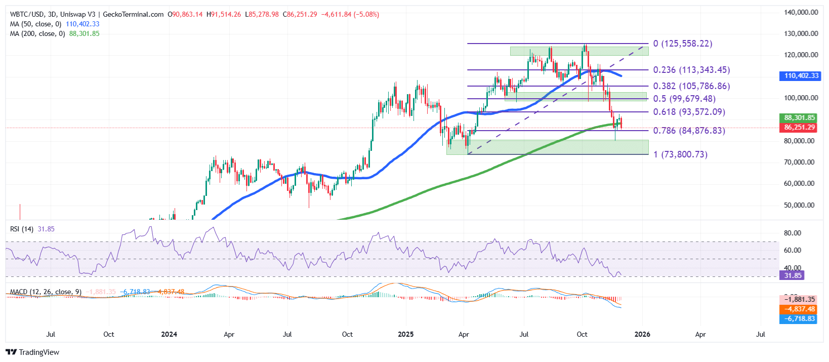 根据BTC/USD三日线图分析,主要技术指标均支持看跌判断。在4月经历抛物线式上涨突破12万美元后,比特币进入震荡整理期。虽然0.236斐波那契回撤位(113,343美元)曾支撑价格创下12.6万美元历史新高,但多头未能守住关键防线,价格已跌破0.786斐波位(84,876美元)。