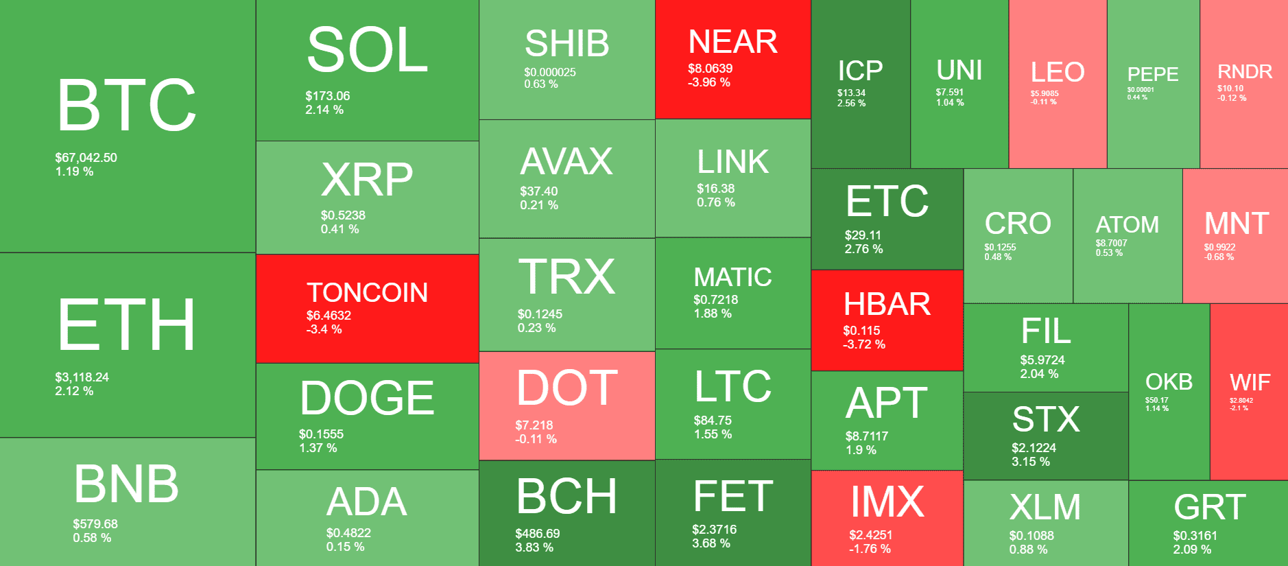 在过去24小时内,比特币延续了近期涨势,昨日价格攀升至67,400美元以上,创下逾一个月新高。以太坊也终于加入上涨行列,成功突破3000美元关键阻力位,并跃升至3100美元上方。