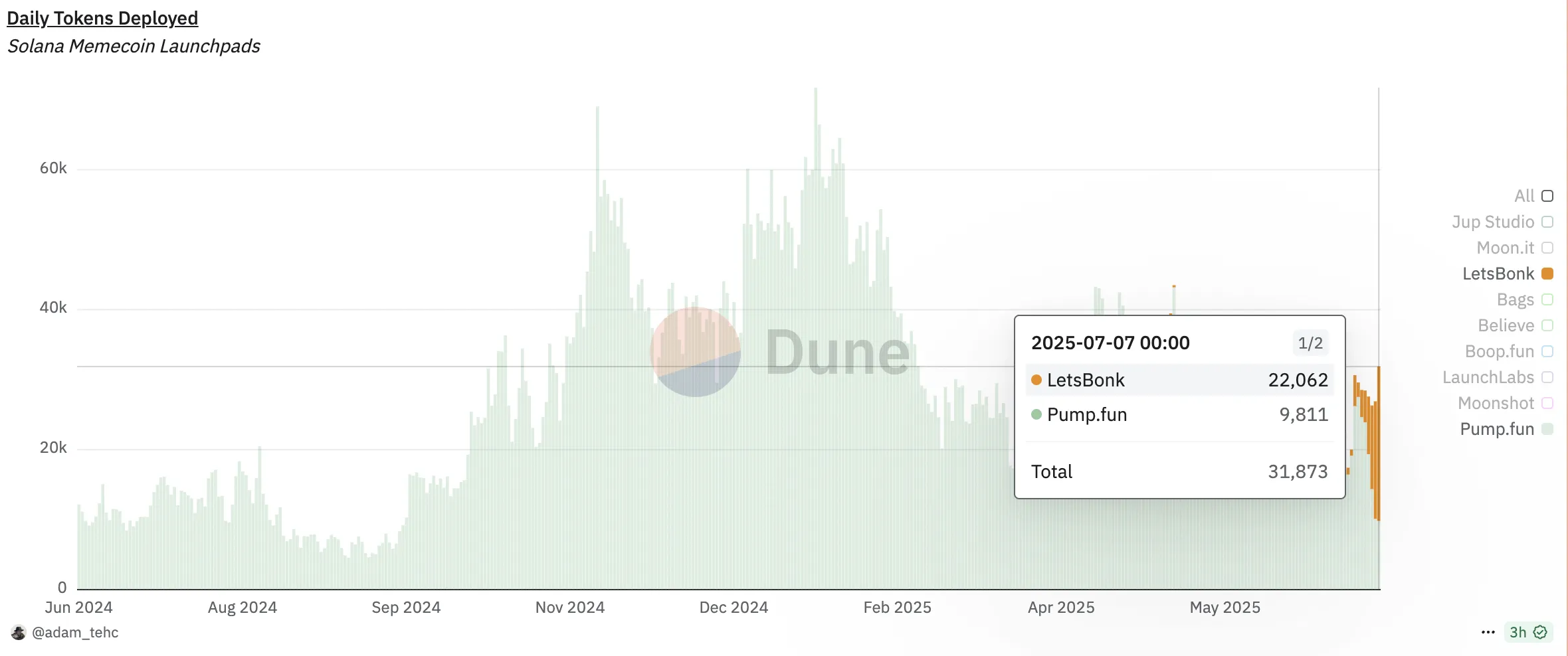 过去一周BONK的价格上涨与LetsBonk平台的爆发式增长密切相关。数据显示,该平台在日活用户数和营收方面已超越此前行业领导者Pump.fun。仅昨日单日,通过LetsBonk创建的迷因币数量就达22,000余个,是同期Pump.fun平台9,800个发行量的两倍有余。