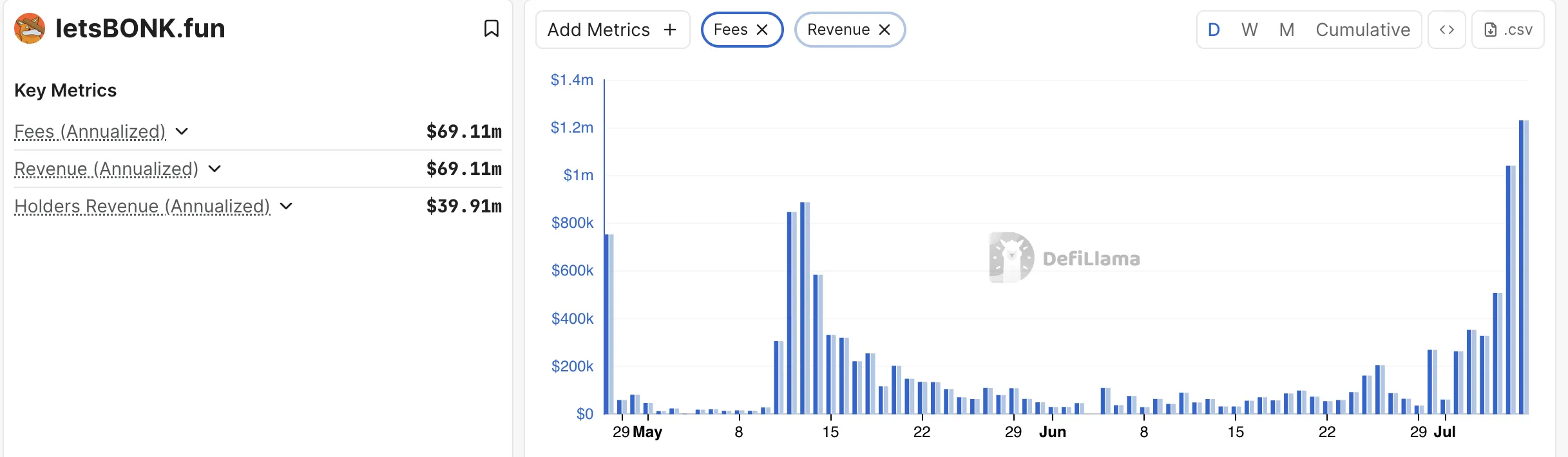 据DefiLlama统计,同期LetsBonk平台总收入达123万美元,显著超过Pump.fun记录的520,419美元。
