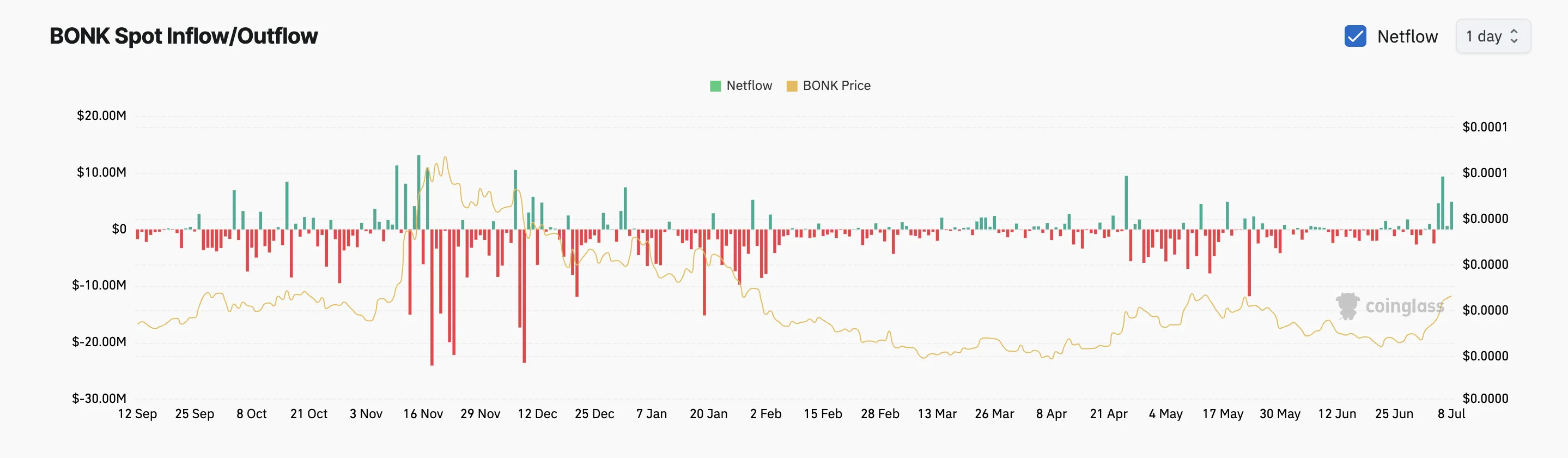 LetsBonk上新代币的创建热潮直接推高了BONK需求。截至发稿时,该迷因币报0.000023美元,七日涨幅达66%。现货市场持续资金流入显示强劲看涨势头——Coinglass数据显示,仅过去四天BONK现货市场就吸纳超1900万美元资金,其中周一单日