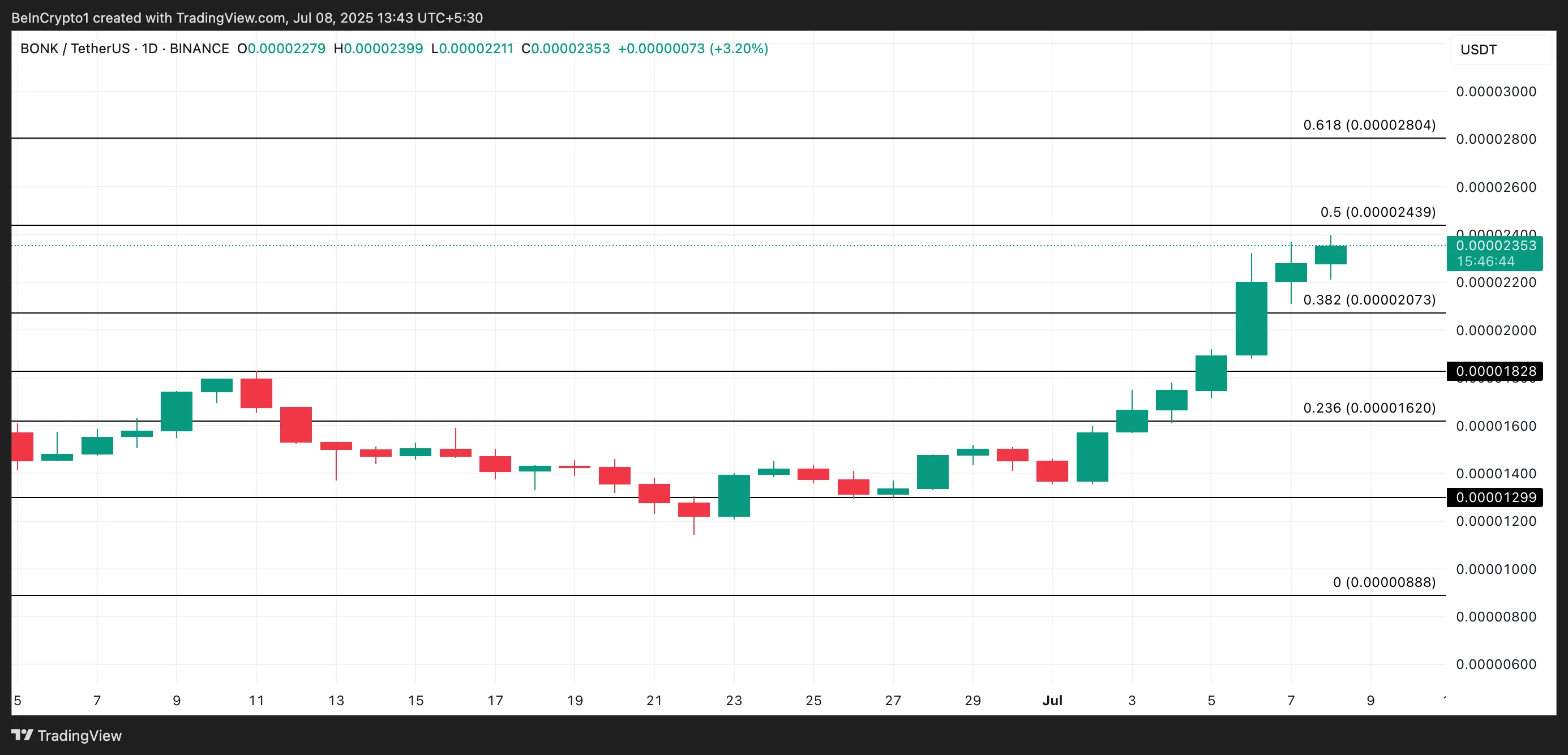 当前BONK交易价格仍低于0.00024美元的长期阻力位。若上升趋势延续,或将助推其测试该关键位置。成功突破后,价格有望上探0.000028美元。