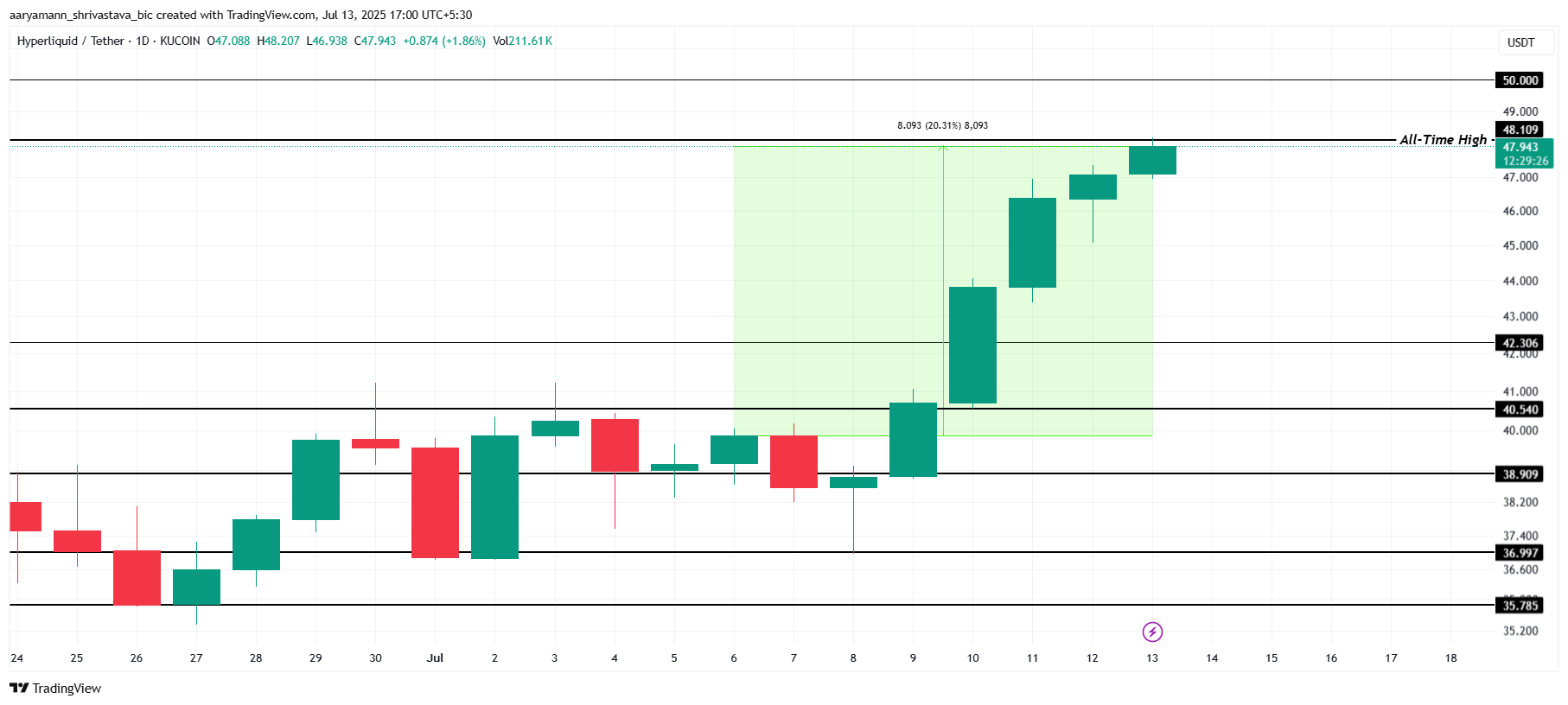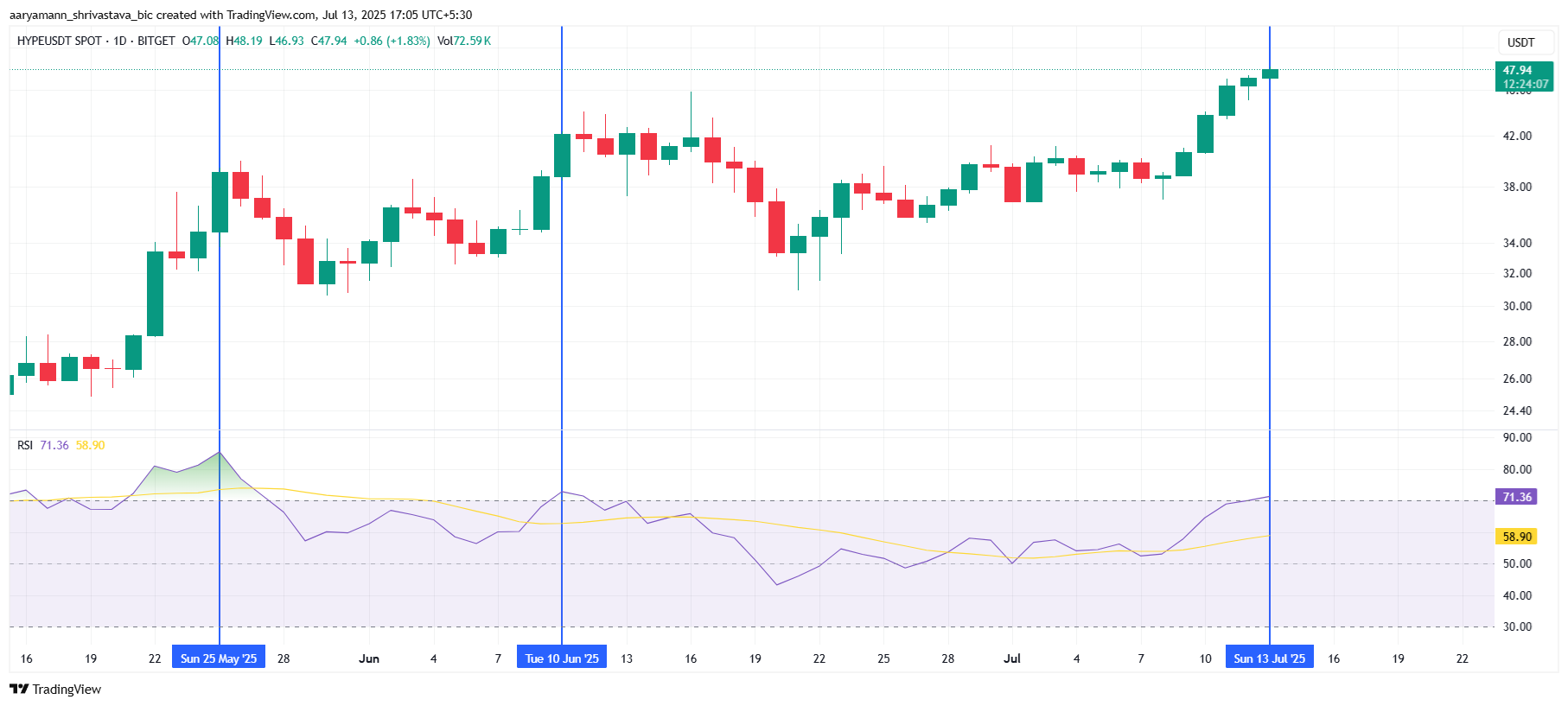 Hyplerliquid原生代币HYPE在过去七天内实现20%的强劲涨幅,创下48.10美元的历史新高(ATH)。然而在市场整体可能面临回调的背景下,该山寨币正显现潜在反转风险。比特币的持续走势将成为决定HYPE后市动向的关键因素。
