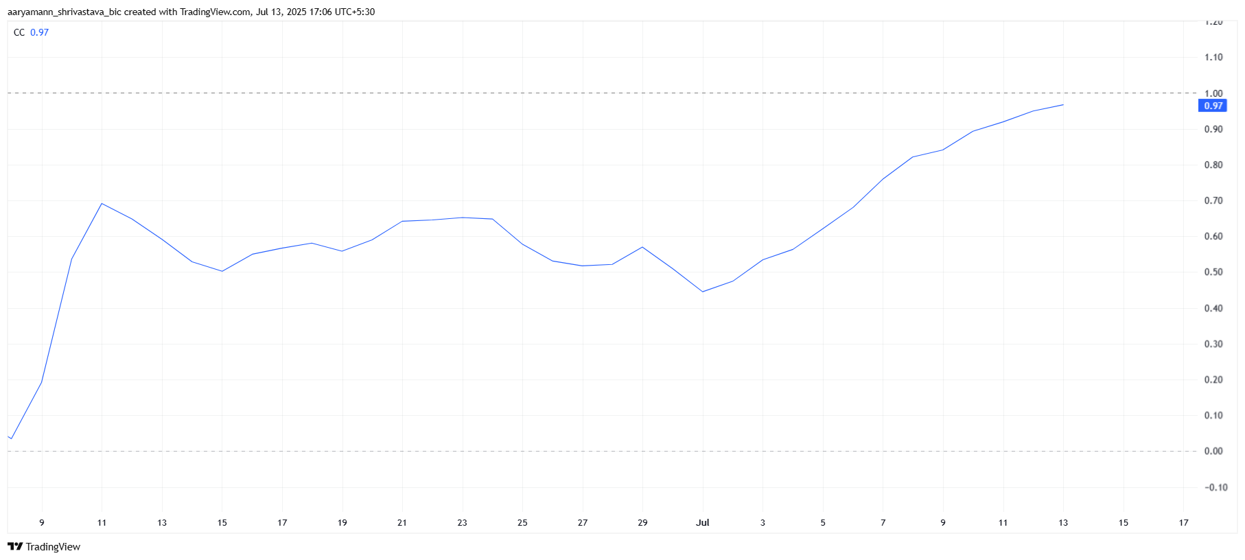 HYPE与比特币呈现0.97的极高相关系数,这意味着其价格大概率将跟随比特币波动。鉴于比特币近期保持上涨趋势,HYPE或能受益于BTC的持续走强。比特币的价格波动对包括HYPE在内的山寨币影响显著。但若比特币出现反转,HYPE很可能同步回调。