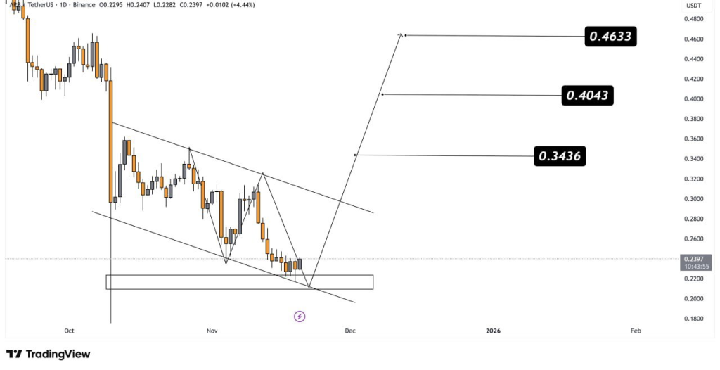 若成功从支撑位反弹,将为买家提供有利入场时机。正如Rose Premium Signals指出:"此处的有效反弹可能推动价格上探0.3436美元、0.4043美元和0.4633美元",表明在市场条件配合下存在上行空间。