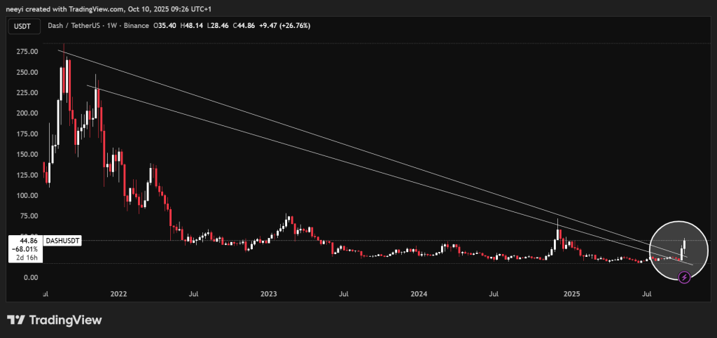 达世币价格上周开始波动,短暂回调后再度飙升,24小时内涨幅超过30%。这一走势意义重大,因为它使DASH摆脱了自2021年以来持续承压的下跌趋势。若能强势周线收于该阻力区上方,可能标志着更大级别的趋势反转。