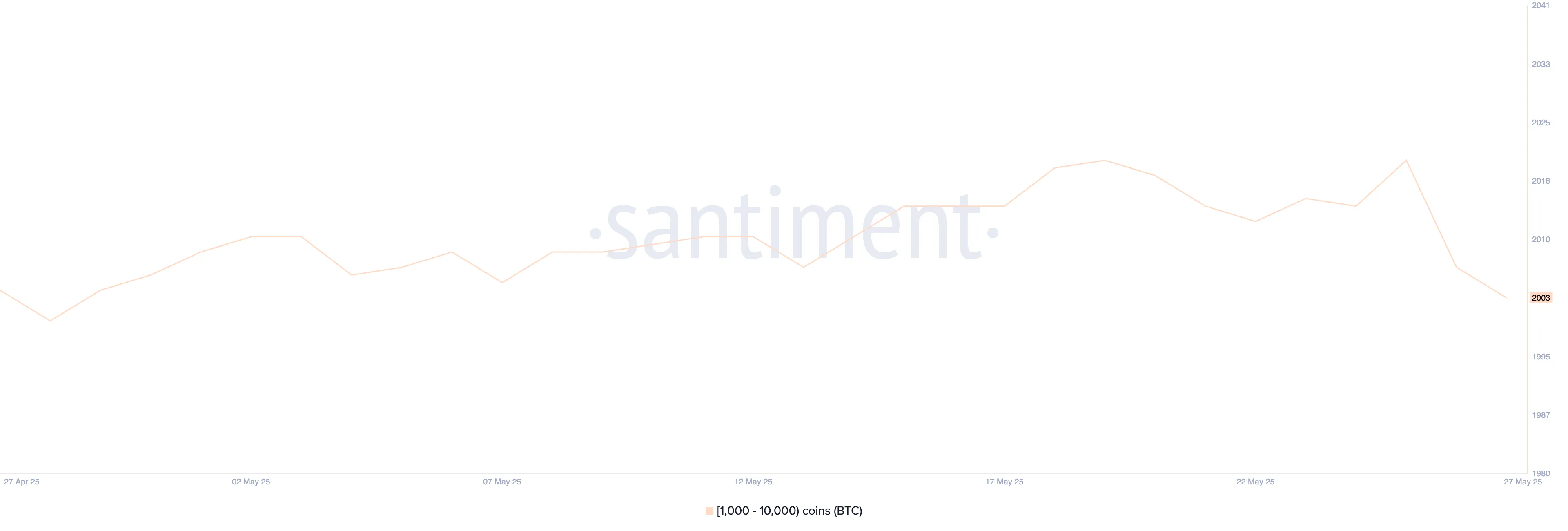 持有1,000至10,000枚BTC的巨鲸钱包数量在5月25日攀升至2,021个,创下近一年新高。这些大额持有者被视为市场最具影响力的参与者之一,巨鲸数量增长通常被解读为长期投资者信心增强的信号,特别是在价格同步上涨时期。