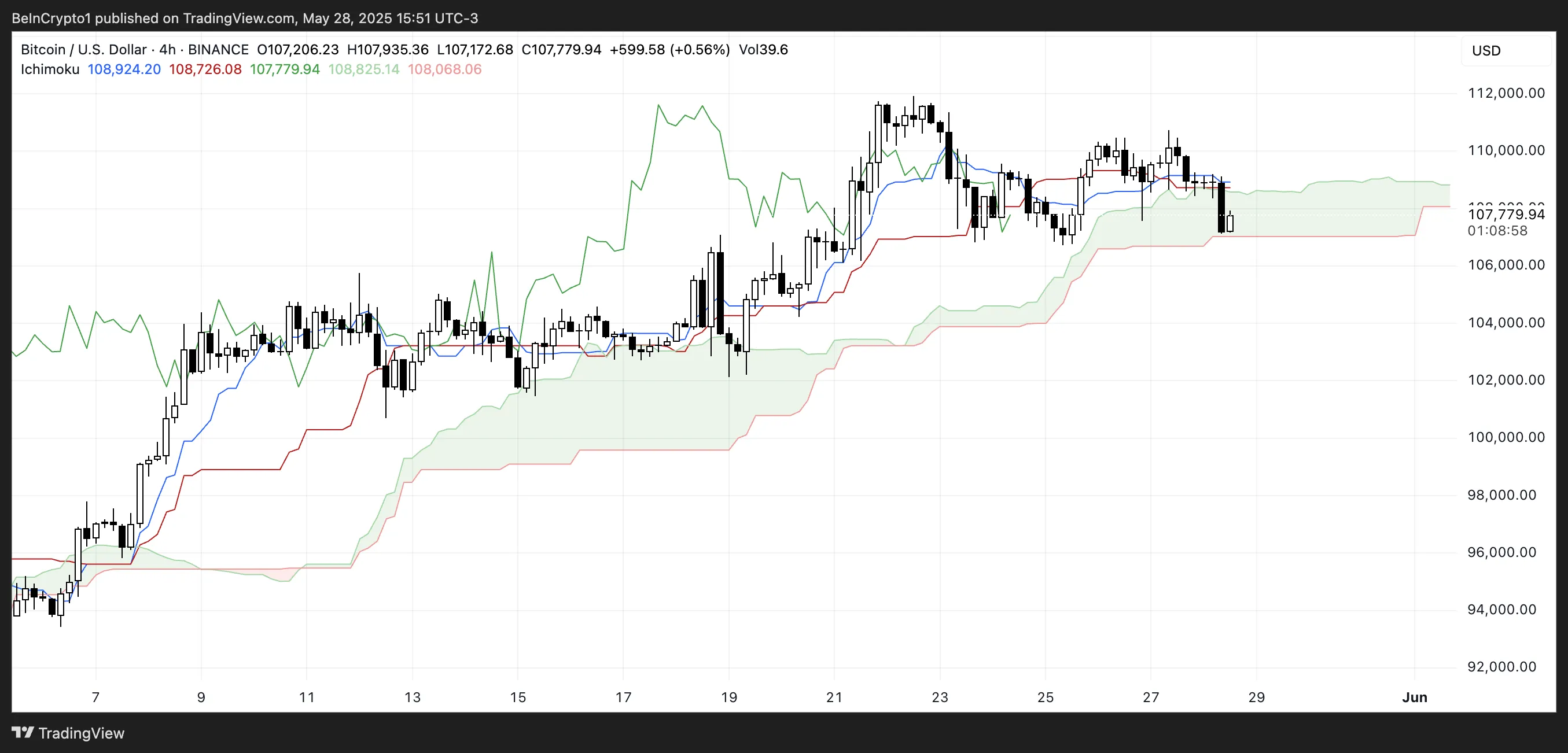 当前比特币一目均衡表中,转折线(蓝线)仍位于基准线(红线)上方,表明短期动能强于中期趋势——这通常是看涨信号。不过价格已跌入绿色云层,暗示市场进入不确定阶段并可能出现盘整。