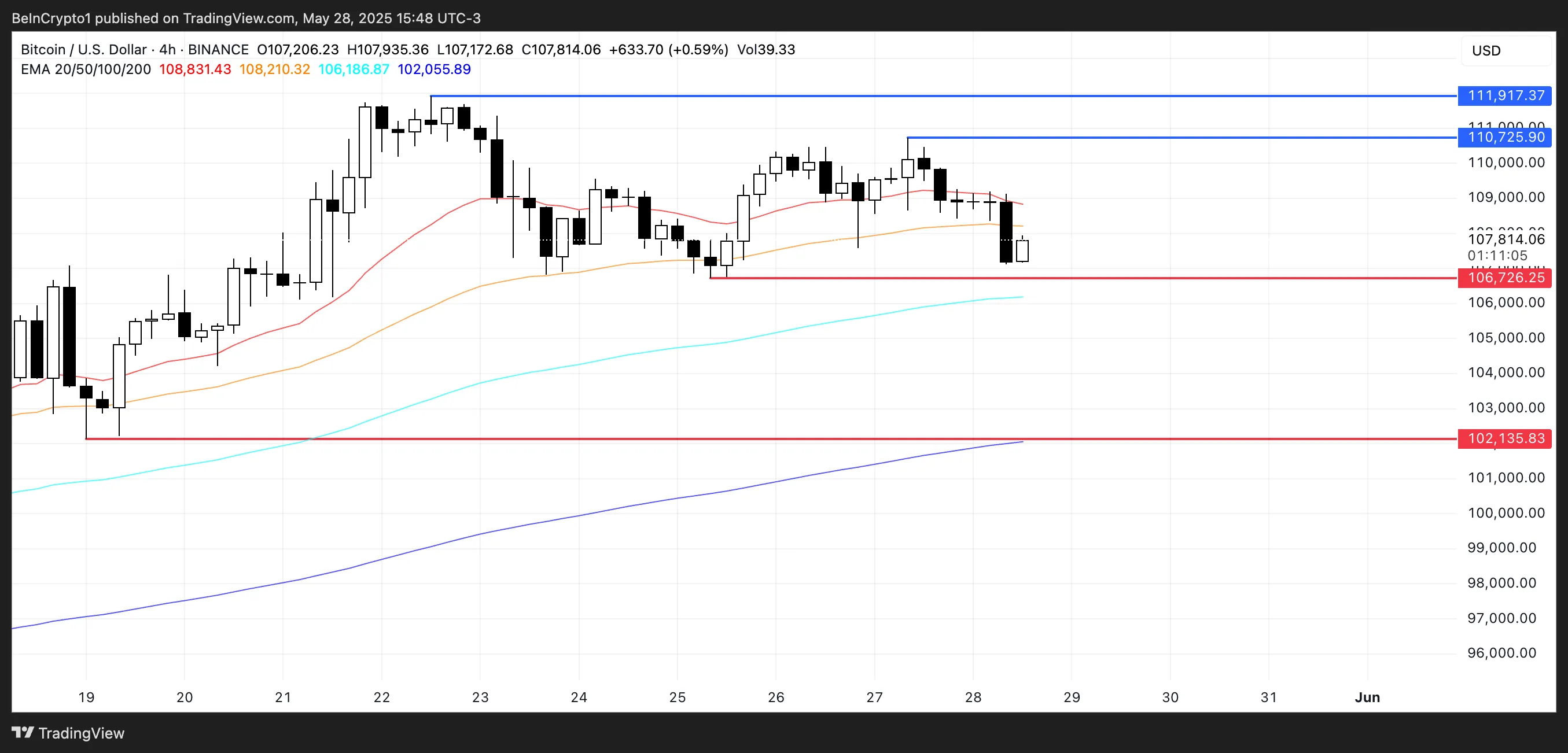 BTC可能测试106,726美元支撑位,若该点位失守,102,135美元将成为下一关键观察区域。反之若买盘重获主导权,多头或首先挑战110,725美元阻力区,突破后可能再次上探近期创下的112,000美元历史高点。