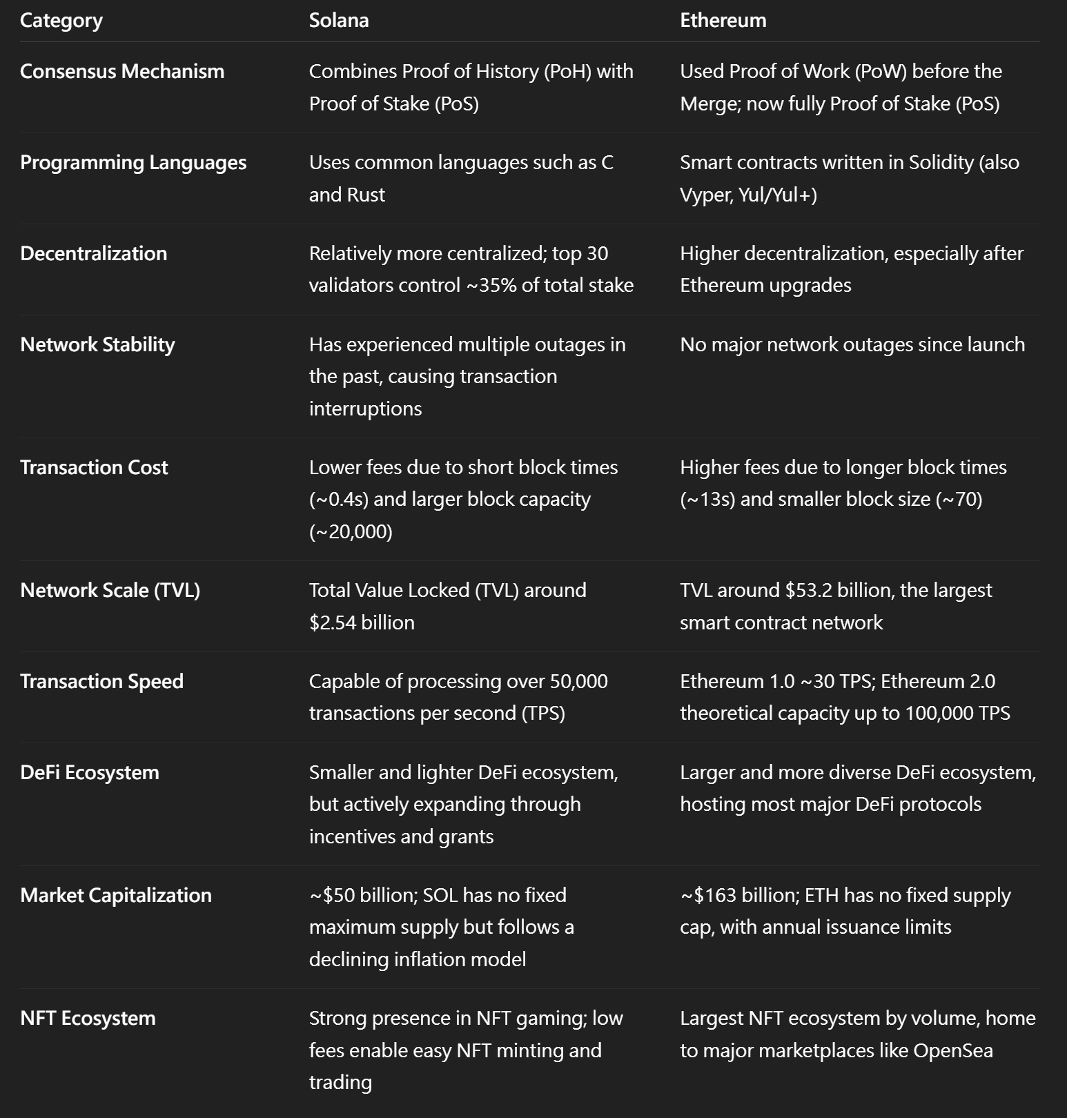 话虽如此,对于个人用户和投资者而言,决定哪个区块链“更好”最终归结于具体的需求和用例。如果您是开发者,底层技术和网络架构可能是比较 Ethereum 和 Solana 时的关键考量因素。每个区块链都遵循独特的设计理念,具有不同的共识机制和可扩展性权衡。就交易吞吐量而言,Solana 是目前最快的区块链之一,而 Ethereum 处理的总交易量明显更高,并且与更广泛的加密市场整合得更深入。