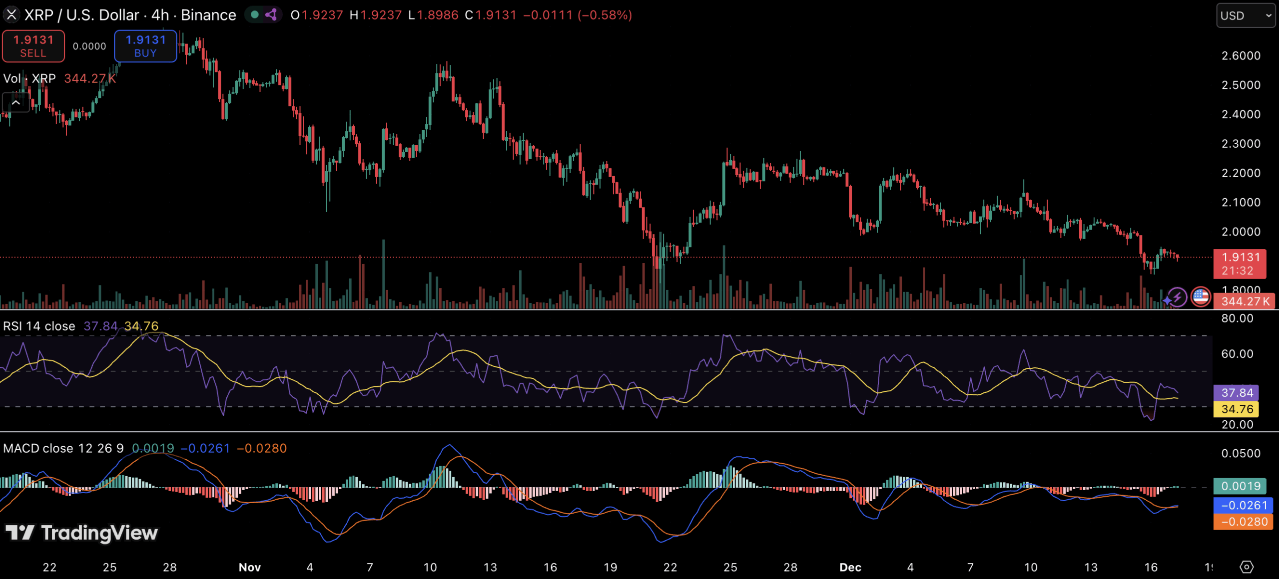 动量指标佐证了这种谨慎判断。4小时图上RSI已回落至30中位区间,显示动能减弱但未进入全面投降阶段,符合周期末段回调特征。MACD仍处于信号线下方,确认短期下行压力,但柱状图幅度较浅,表明市场处于压缩状态而非加速下跌。