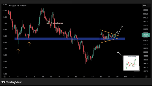 当前K线正在测试三角旗上轨,出现的轻微回调符合突破初期的典型回踩特征。交易员密切关注XRP突破11月下旬以来压制价格的趋势线时,是否会伴随成交量放大。