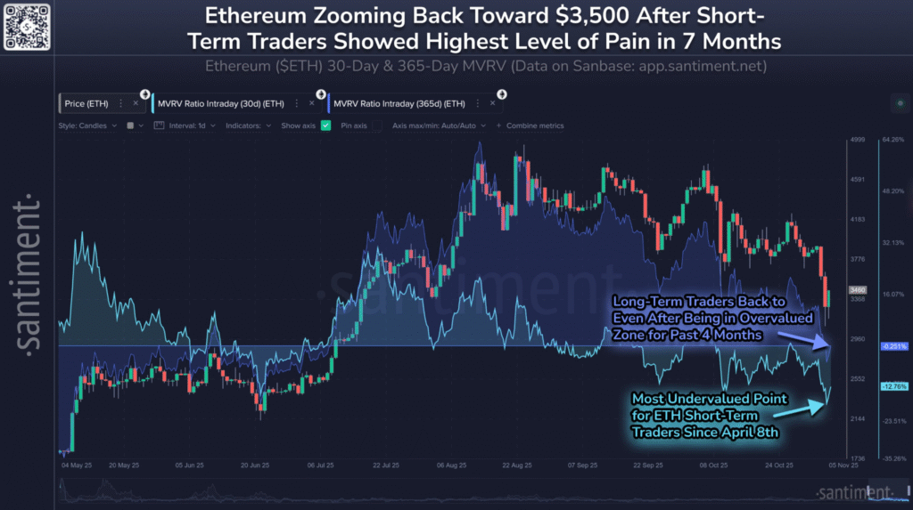 以太坊持续的价格修复标志着市场从潜在高估状态转向更有利买家的阶段。在短暂跌破3000美元后,其价格已回升至3500美元附近。虽然短期交易者的MVRV比率显示市场仍处困境,但同时也凸显以太坊可能为投资者提供低风险入场点。