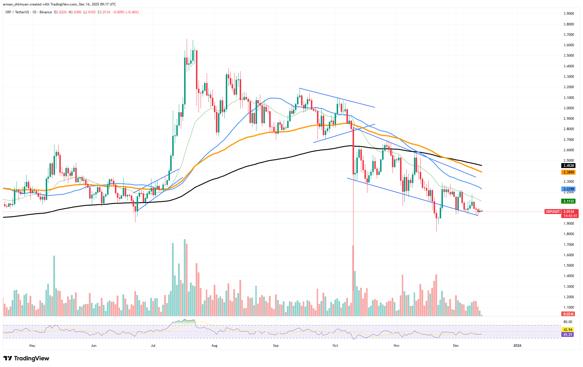 首先需要关注市场背景。XRP价格仍在宽幅下跌结构中挣扎,高点不断下移,且受到重要移动平均线的强劲阻力压制。自十月份破位下跌后,价格始终未能有效收复中轴区间,动能表现疲弱,相对强弱指数在中性至看空区域徘徊。仅从图表来看,并未显现即时突破迹象。由于卖盘仍倾向于逢高抛售,当前走势更似派发后的震荡整理。