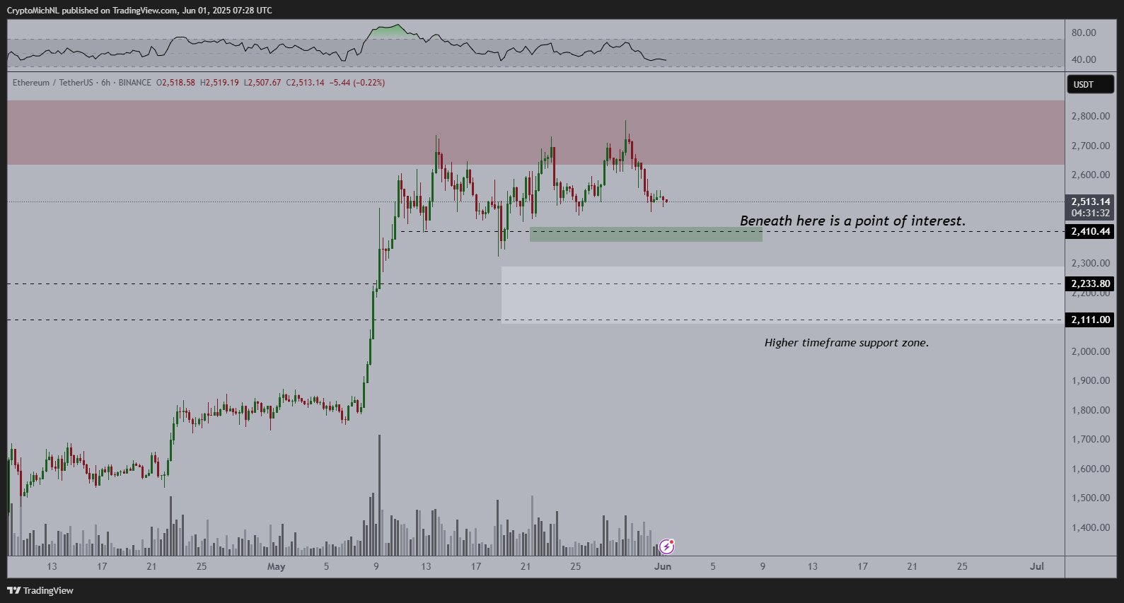 与此同时,分析师Poppe保持看涨立场,预测增长将持续。根据附带的图表,他建议在ETH低于2400美元的任何短期深度回调时买入,可能构成有吸引力的机会。