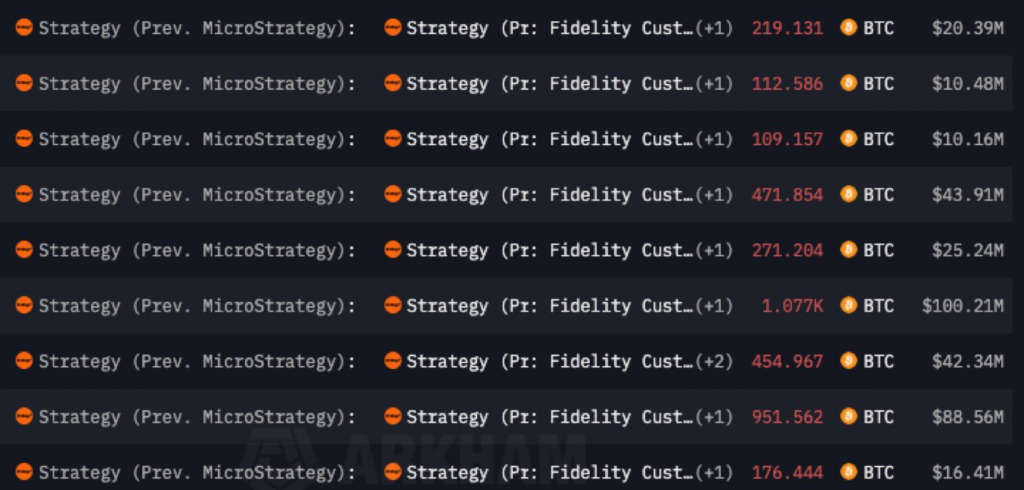 战略公司(前身为微策略)钱包记录显示,共发生9笔总额超10亿美元的转出交易。市场对潜在抛售的猜测引发比特币价格回调。不过阿卡姆数据显示,这家最大比特币持仓机构实际上是将11,642枚比特币转移至富达托管钱包。由于主钱包总持仓降至4328枚比特币(约400.8亿美元),交易机器人可能触发了抛售程序。