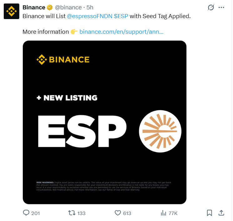 消息公布后,交易者迅速反应,推动该代币价格应声上涨。全球最大加密货币交易所之一的币安已确认,将于2026年2月12日世界标准时间13:00,在其现货交易平台正式上线Espresso代币。该代币将带有"种子"标签,意味着其为新上市项目,可能存在较高风险与价格波动。Espresso的提现功能将于次日(2月13日)世界标准时间13:00开放。
