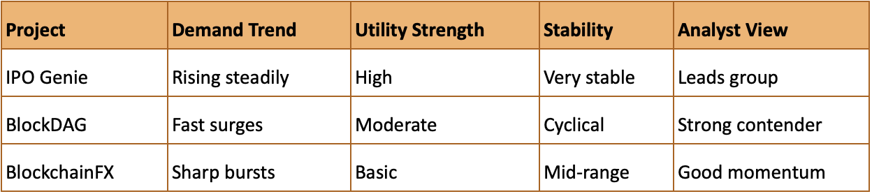 本次比较着眼于三个新兴的预售项目:IPO Genie、BlockDAG和BlockchainFX。三者均在加密货币新闻中获得关注并显示出强劲信号。每个项目都有良好的发展势头,但IPOGenie因其结构化的设计和真实的实用性而略胜一筹。