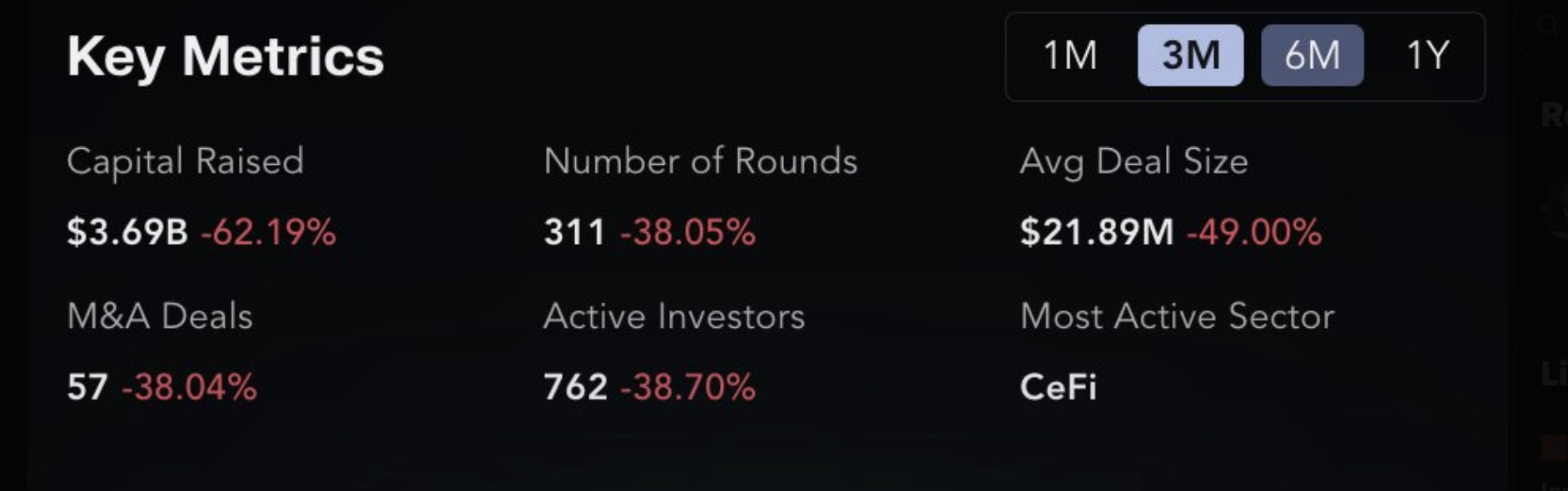 加密融资规模急剧下降——过去3个月,筹集资金额下降62%,交易数量减少38%,平均交易规模近乎减半。