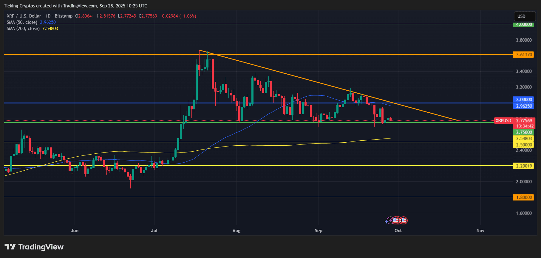 当前XRP价格在2.77美元附近窄幅震荡,上方阻力位3.00美元与下方支撑位2.70美元形成关键区间。根据最新XRP周线美元价格走势图 - TradingView