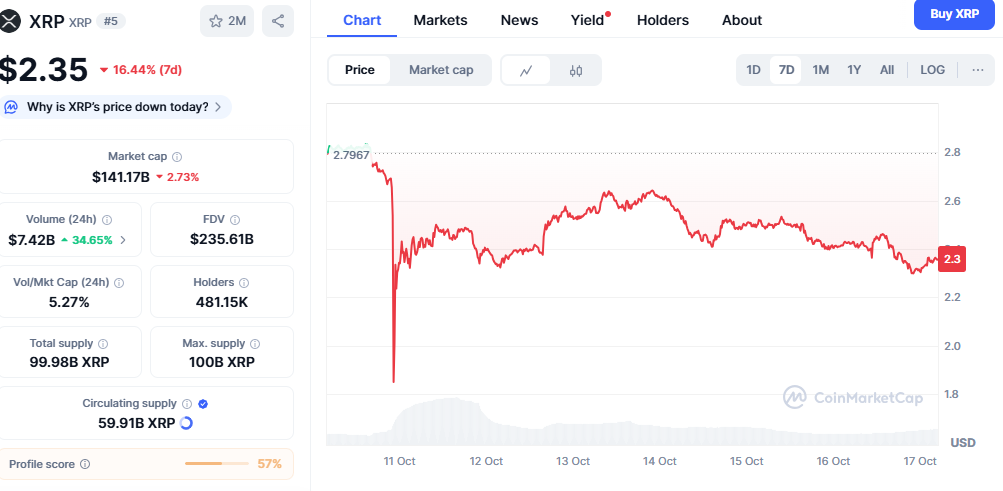 XRP价格在周线图上暴跌16%后回落至2.3美元水平。尽管该支付类代币曾触及3.1美元的月内高点,但当前走势与整体加密市场同步下行。分析师指出,中美贸易摩擦升级的担忧加剧了市场抛压——投资者普遍选择规避政策不确定性带来的风险。若多头未能守住2.0美元关键支撑位,XRP可能进一步下探1.5美元。