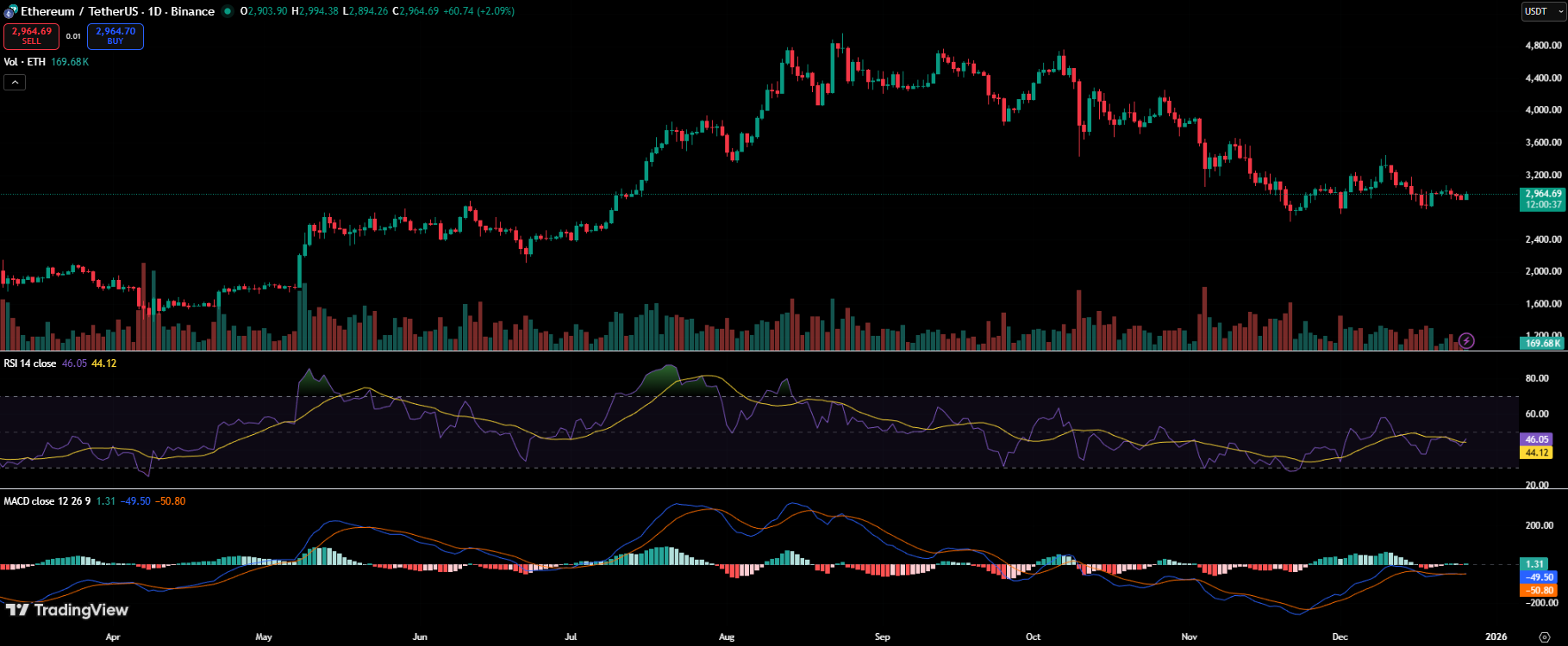 动量指标反映了这一降温阶段。日线RSI在40出头的低位徘徊,表明看跌压力已缓解,但买家尚未重新掌控局面。从历史上看,Solana需要RSI回升至50-55区间以上才能确认真正的趋势反转。
