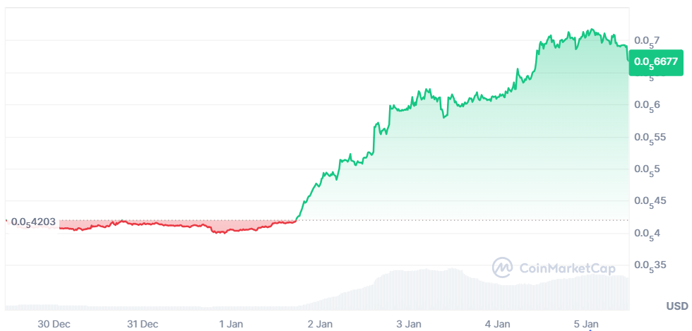 PEPE在过去一周上涨超61%。其市值自1月1日的17.94亿美元起步,于1月5日突破30.1亿美元高点。截至撰稿时,PEPE交易于0.05美元上方,市值超28亿美元。