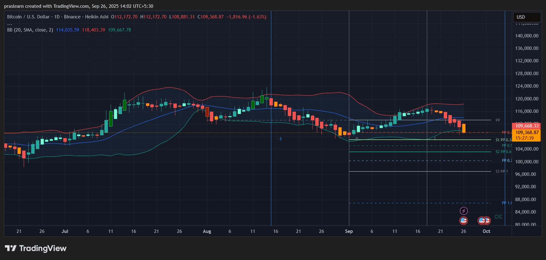 比特币(BTC)在未能站稳112,000美元关口后回落至109,300美元附近。Heikin Ashi蜡烛图连续呈现红色柱体,显示持续抛压。布林带持续扩张,比特币正测试109,600美元附近的布林带下轨,表明下行波动可能加剧。