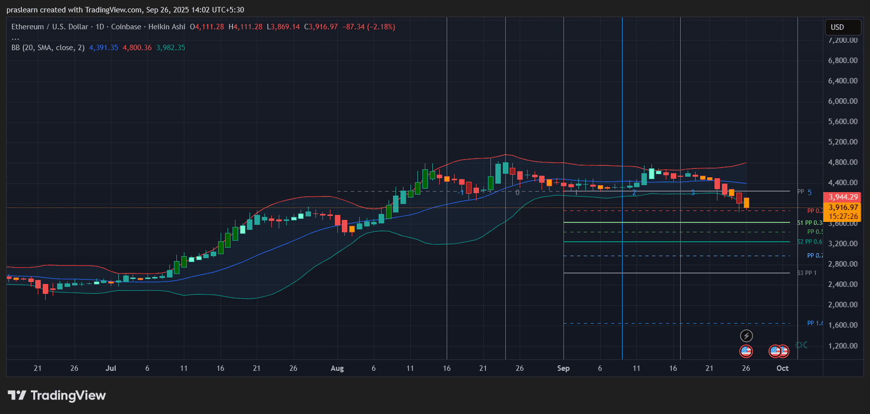 以太坊(ETH)现报3,920美元下方,已跌破20日均线。与比特币类似,ETH的Heikin Ashi蜡烛图维持看跌形态,目前徘徊在3,800美元关键支撑位上方。布林带开始发散,预示波动可能加剧。