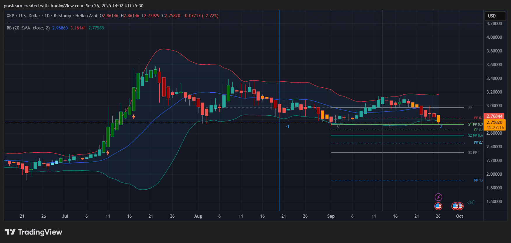 瑞波币(XRP)面临更大压力,日内下跌近3%后交投于2.75美元附近。自9月中旬以来形成连续低点,目前正在测试2.70-2.60美元关键支撑区。若跌破该区域,可能快速下探2.40美元。