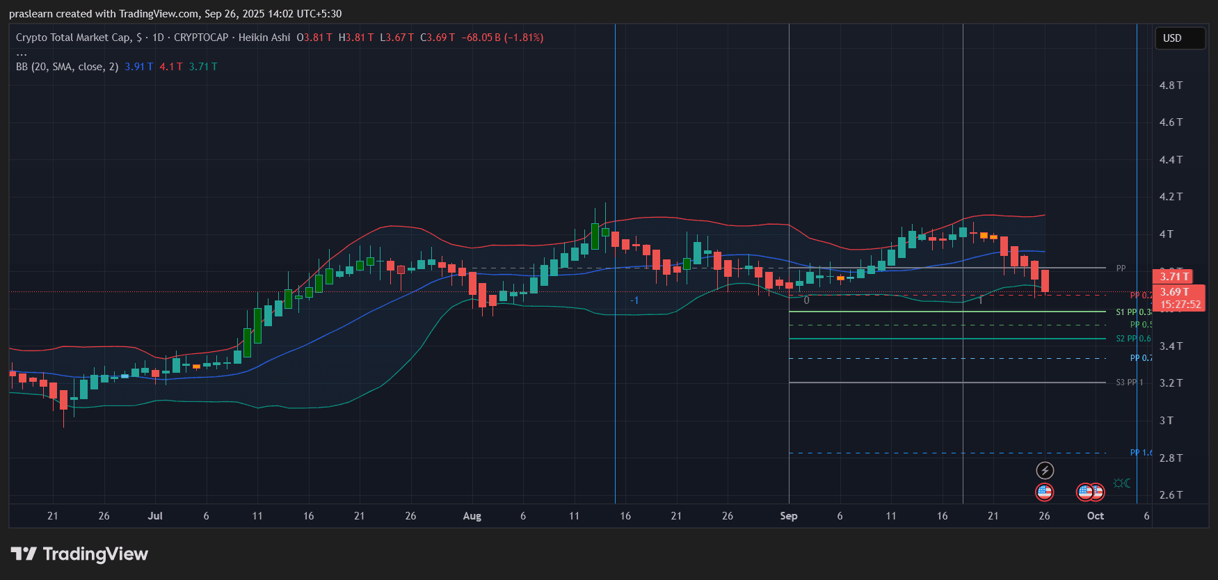 加密货币总市值已从近期高点回落至3.69万亿美元。日线图显示红色Heikin Ashi蜡烛与布林带下轨扩张,表明市场整体疲软。当前支撑位于3.60万亿美元,若抛压加剧可能下探3.40万亿美元。