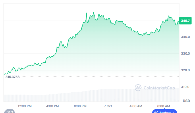 最新市场分析显示,TAO现报348.12美元,日内涨幅9.27%。市值34.9亿美元,完全稀释估值73.1亿。24小时交易量增长91.99%至1.973亿美元,表明交易所持续存在需求与流动性。