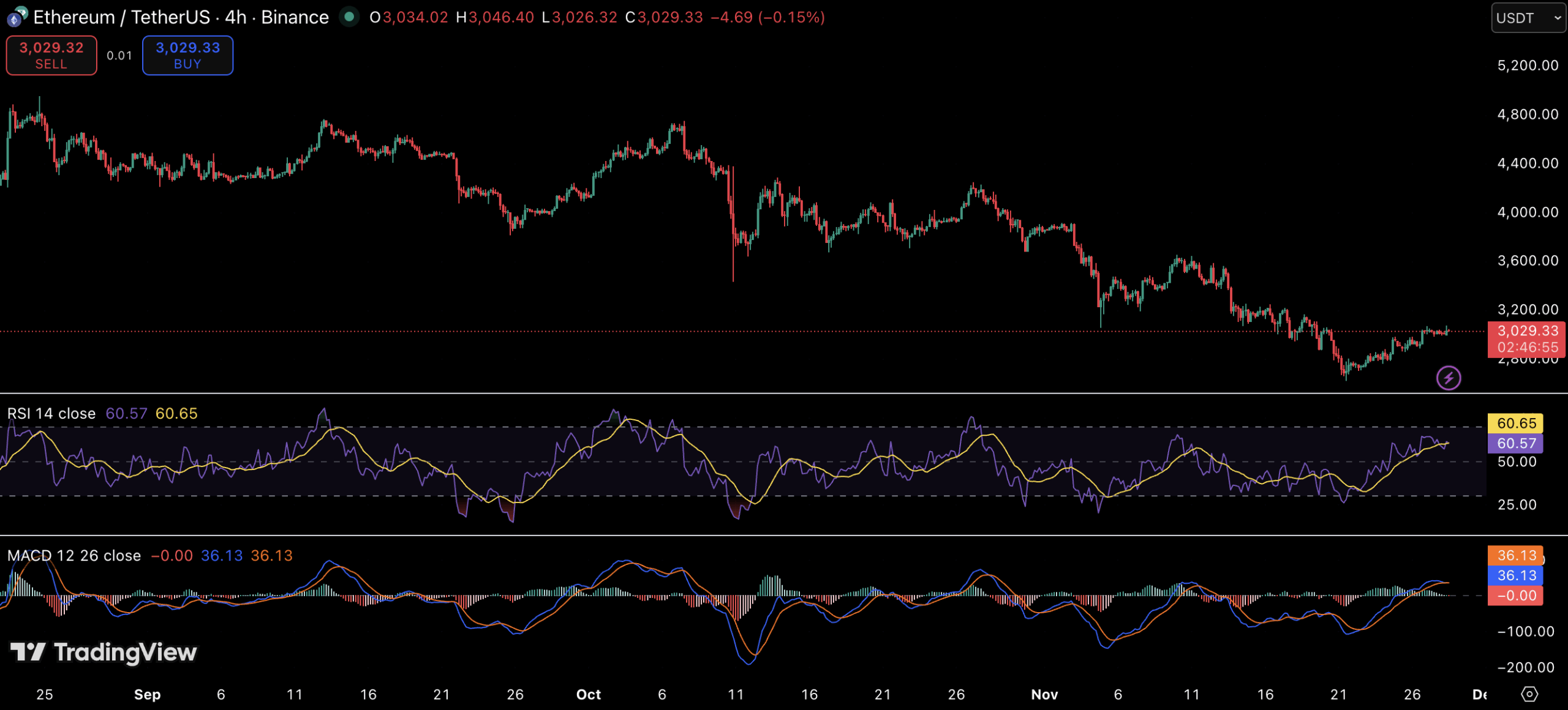 市场反应平静但具有建设性。以太坊交易价格徘徊在3,029美元附近,链上数据与图表均显示深层趋势改善:4小时线RSI已攀升至60区间低位,反映看涨动能增强而未进入超买区域;MACD形成金叉后稳步扩张,这种结构通常被交易者视为趋势延续而非反弹信号。