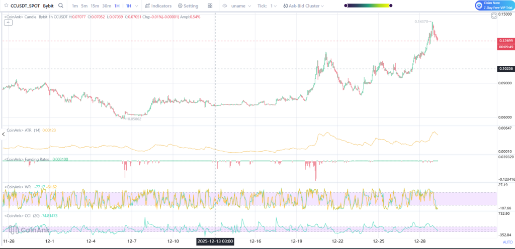 在1小时图表上,CC价格曾在0.10美元下方持续窄幅震荡数周。当突破0.10-0.105美元区间后,买盘迅速涌入推动价格强势上扬。在攻克0.12美元附近的前期阻力位后,涨势进一步加速,价格快速上探0.14美元后出现小幅回调。目前回调幅度可控,价格仍稳固站在突破区域上方。