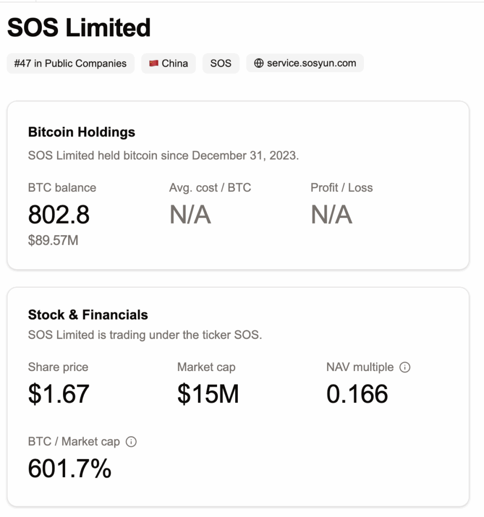 以美国知名矿企MARA控股为例,其股价目前约为1倍mNAV,意味着市值与其持有的比特币价值完全持平。更极端的案例是中国矿企SOS Limited,其交易价仅为0.16倍mNAV,股价仅反映其比特币储备价值的16%,成为上市比特币持仓企业中折价最严重的案例之一。