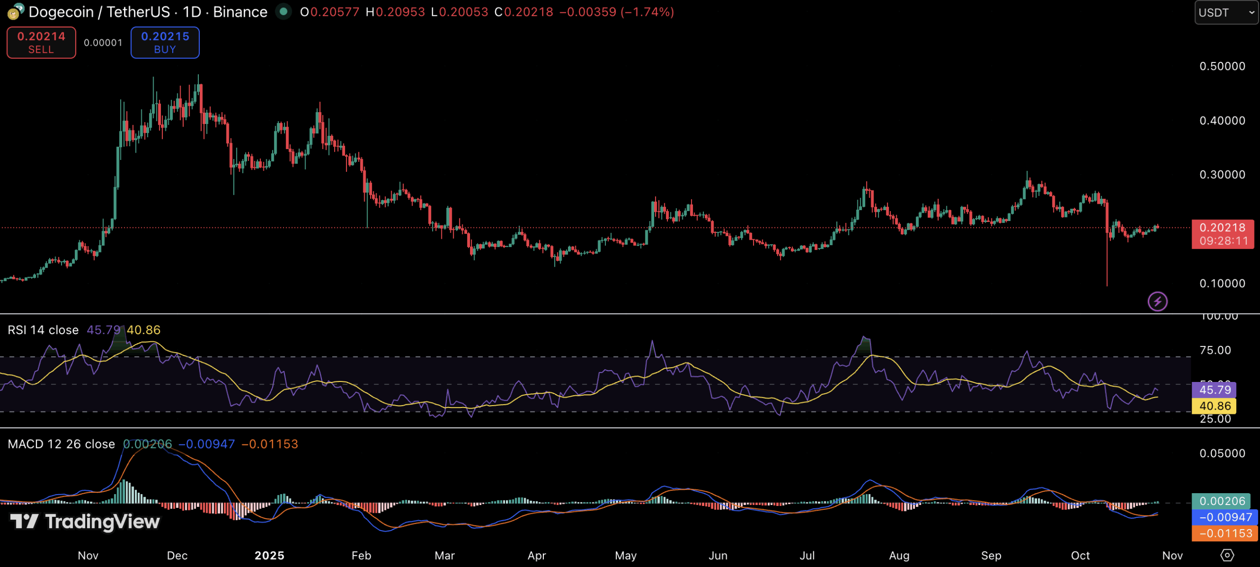 当前DOGE交易于0.20美元附近,14日相对强弱指数(RSI)回升至46左右,表明近期回调后动能趋于中性。与此同时,异同移动平均线(MACD)指标显现初期看涨交叉信号,若得到成交量配合,或标志着更广泛复苏阶段的开始。