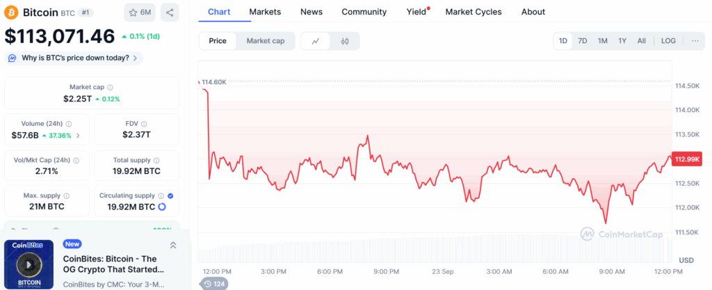 BTC价格近7日下跌2.45%,近30日跌幅达1.65%。不过在撰稿时,过去24小时微涨0.1%,现报113,071.46美元。同期交易量增长37.36%,约576亿美元。