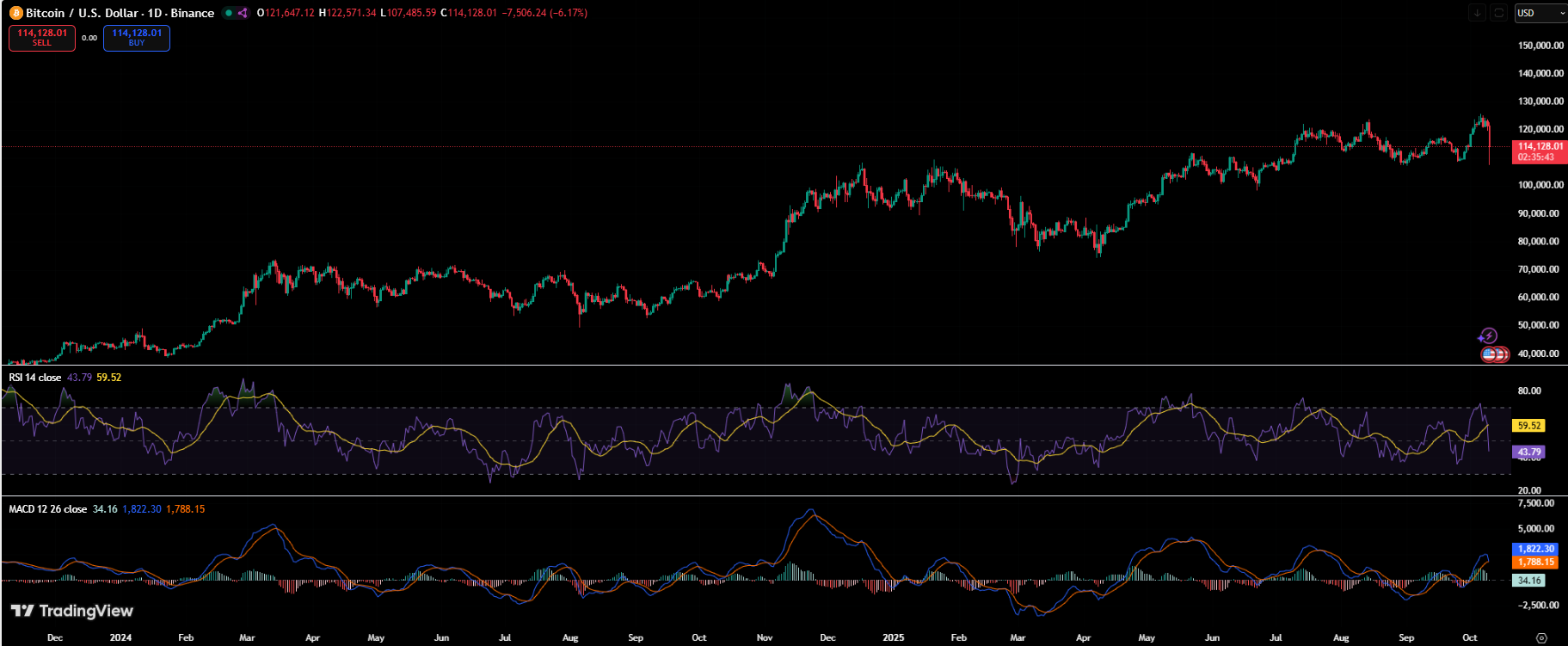 据币安数据显示,暴跌后比特币价格短暂触及107,485美元,随后迅速回升至11.4万美元关口。相对强弱指数(RSI)下滑至45中位区间,表明市场正从超买状态降温;异同移动平均线(MACD)则出现数周来首次负值,这通常被解读为上涨动能减弱的早期信号。
