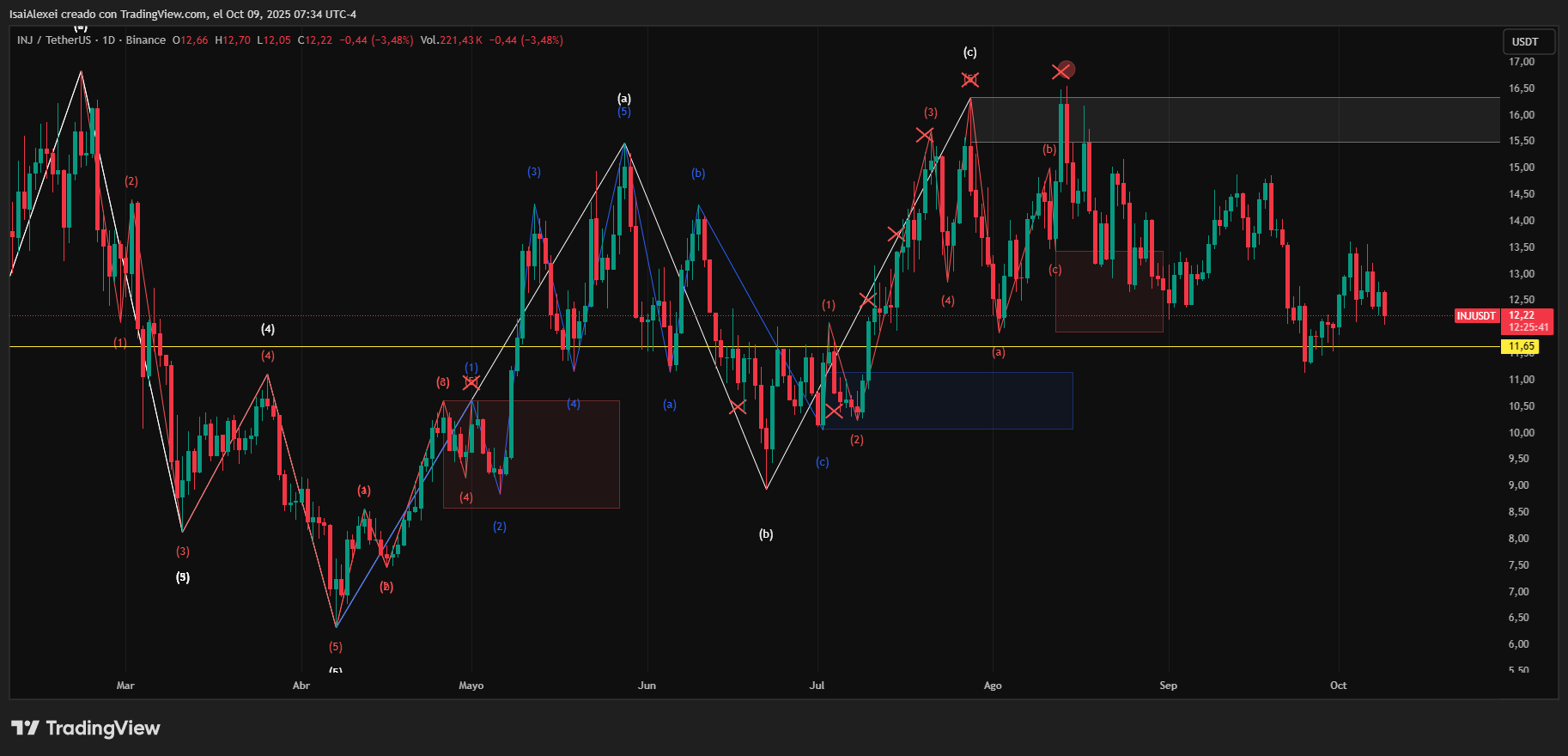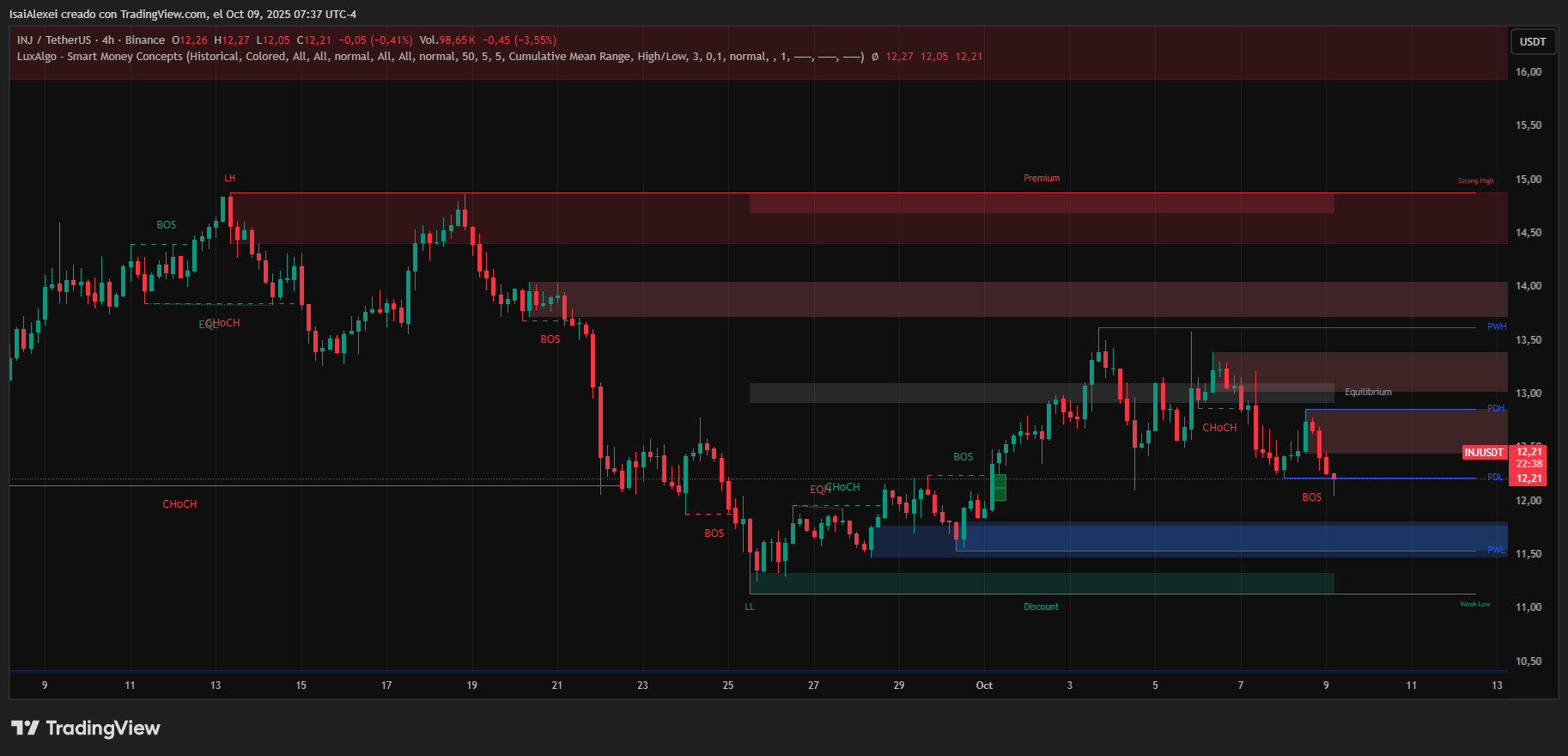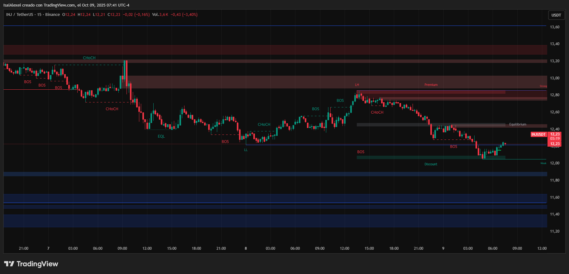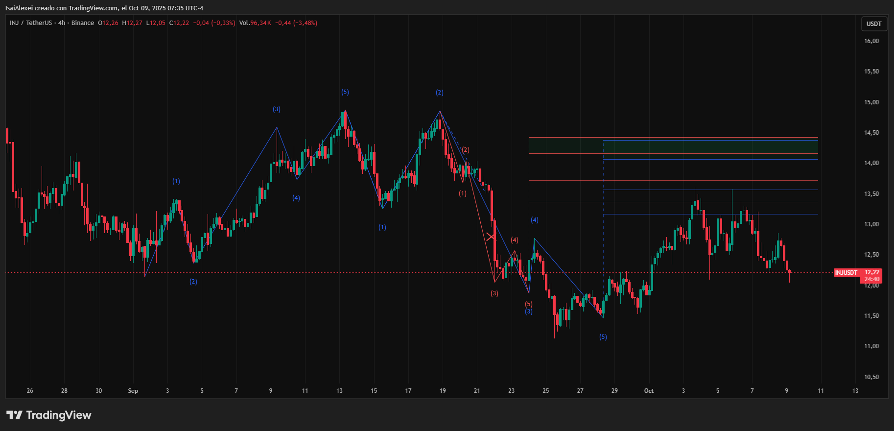 INJ目前处于12.00-12.80美元区间盘整,本周早些时候未能突破12.85美元的短期阻力位。12.05-12.10美元区域构成局部支撑,若明确跌破可能下探11.70美元。反之,若日线收于12.90美元上方,或将推动价格向13.50-14.00美元区间攀升。RSI指标中性位于48附近,显示市场情绪平衡,交易量表明投资者等待新催化剂期间波动性降低。尽管短期疲软,强劲的链上与机构基本面仍支撑其中长期看涨趋势。