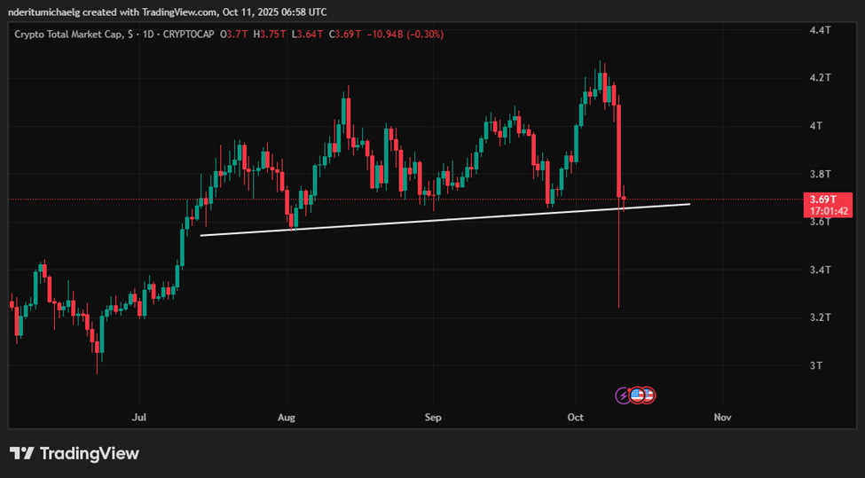 周五闪崩期间,加密货币总市值从4.13万亿美元骤降至3.24万亿美元,流动性水平瞬间回落至今年7月位置。加密货币总市值/数据来源:TradingView
