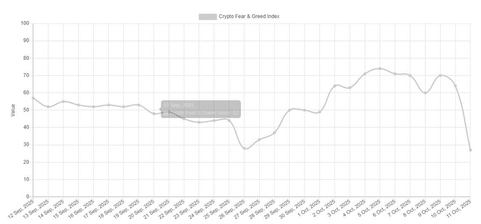 虽然加密市场未受直接影响,但关税战升级仍通过投资环境的不确定性产生传导效应。市场情绪指数已从周五的64点(贪婪区间)骤降至观察时的27点(恐惧区间)加密货币恐惧贪婪指数/数据来源:Alternative.me