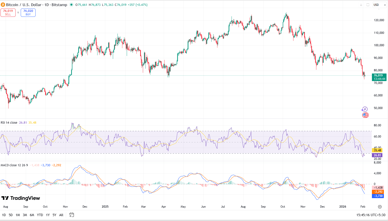比特币自目前约76,000美元的水平仍有下行空间。基于日线图、动量指标及近期专家分析,最现实的下行区间位于74,000美元至70,000美元之间;若抛压加剧,更深跌幅才可能被触发。