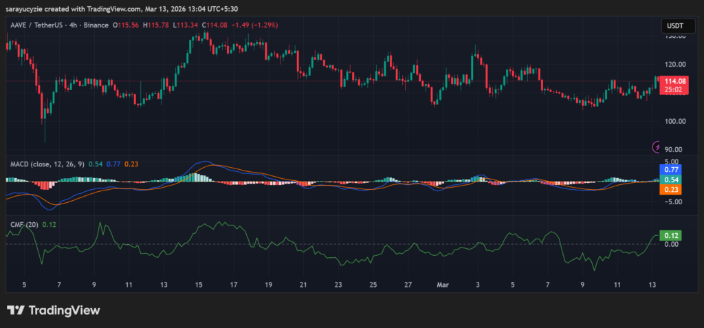 截至撰稿时,AAVE价格上涨5%,交易于113.77美元区间。日交易量增长29.95%,达到3.703亿美元水平。根据Coinglass数据,过去24小时内AAVE市场发生价值55.06万美元的清算。