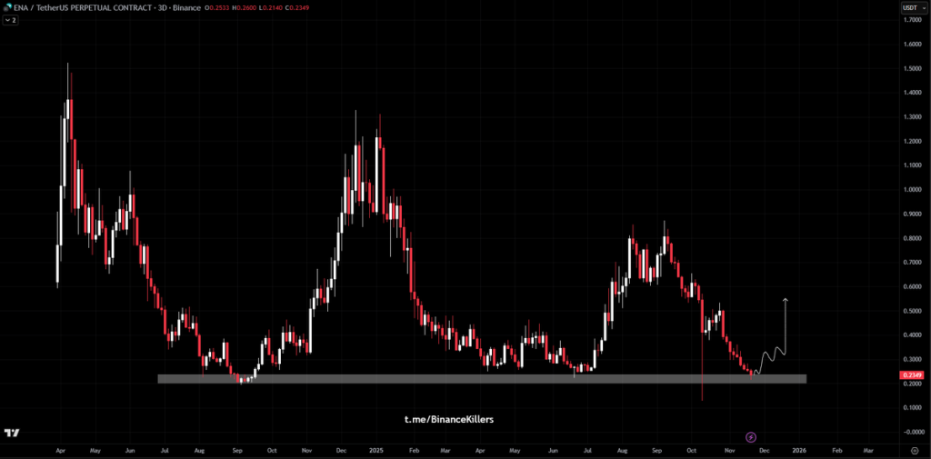 ENA目前正运行于0.23-0.25美元明确支撑区间。该区域在过去接受考验时曾引发上涨行情。历史图表形态显示,当价格进入该区域后,往往会在随后数日或数周内实现反弹。分析师正密切关注该区域能否再次提供支撑。若支撑有效,可能迎来向0.35-0.45美元范围的回升,该目标区域与早期反应高点相符。一位分析师指出:“我们曾见证该水平守住阵地。若历史重演,可能推动价格向上一个阻力带迈进。”