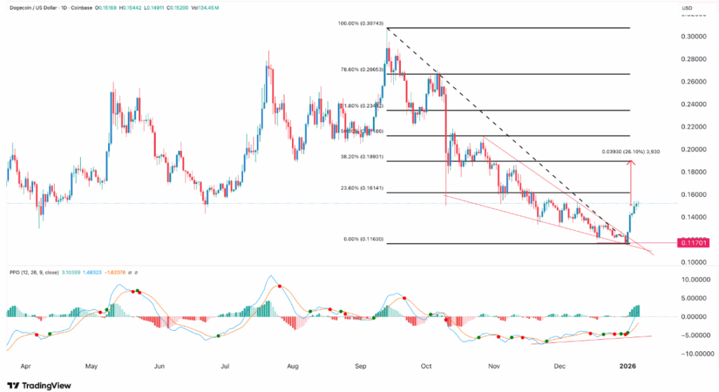 狗狗币的技术图表显示了一个下降楔形突破形态。该形态由逐渐收窄的下行趋势线构成,通常预示着潜在看涨反转。在上涨前,百分比价格震荡指标和相对强弱指数等技术指标已显示出看涨背离,强化了突破信号。