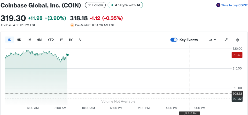 Coinbase(COIN)股价报收319.30美元,涨幅3.90%,显示市场强劲买盘。盘前交易微跌至318.01美元,反映近期上涨后的温和获利了结。