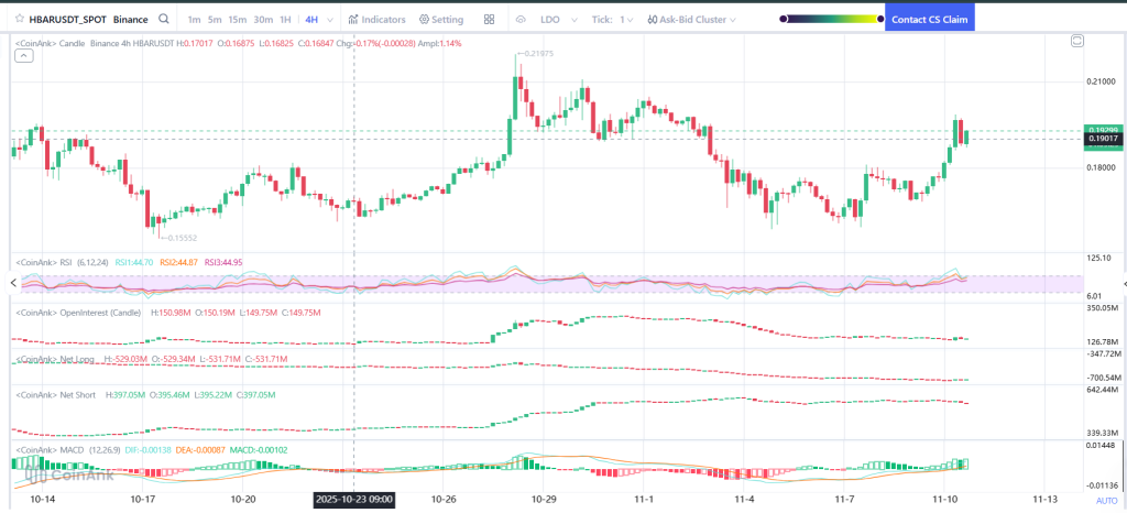 4小时图显示HBAR从0.155-0.16美元强支撑区反弹后,买盘持续发力将价格推升至0.19-0.20美元重要阻力区。10月末虽曾短暂突破至0.219美元,但未能企稳。不过整体结构已明显改善——HBAR首次在数周后形成更高的低点,只要该形态延续,则表明多头力量正在蓄积。