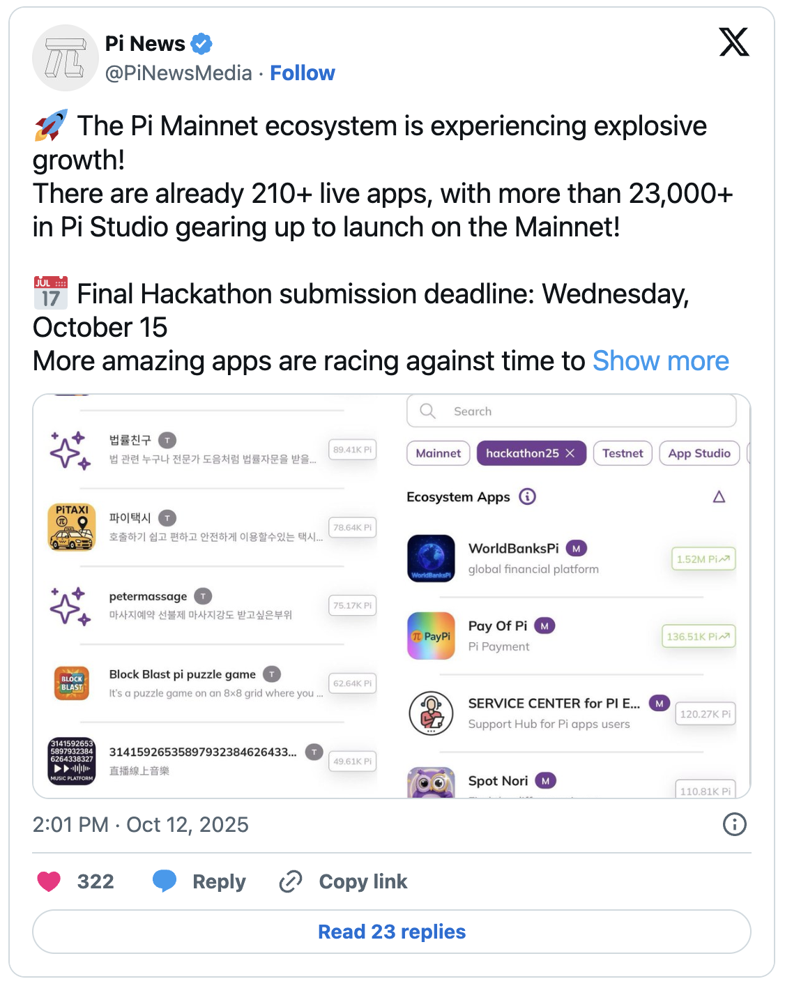 围绕Pi Network的讨论持续不断,而最新生态数据显示该项目正重获发展动能。据专注于该项目的X平台重要频道Pi News披露,其生态内活跃应用数量已突破210个,为主网上线做准备的项目更超过21,000个。随着10月15日提交截止日临近,自8月底黑客松活动后明显加速的开发者节奏正变得更为清晰——在团队9月发布的中期评估中,重点展示了用户使用频率最高的新应用。
